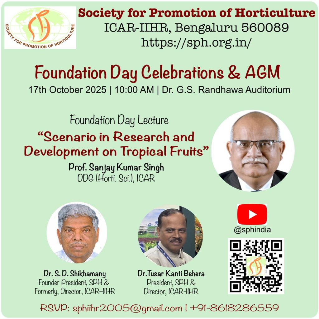 We are pleased to inform you that the Foundation Day celebrations and Annual General Meeting (AGM) of the Society for Promotion of Horticulture (SPH) will be held on Friday, 17 October 2025 at 10:00 AM in the G. S. Randhawa Auditorium, ICAR-IIHR, Hesaragahtta Lake Post, Bengaluru.